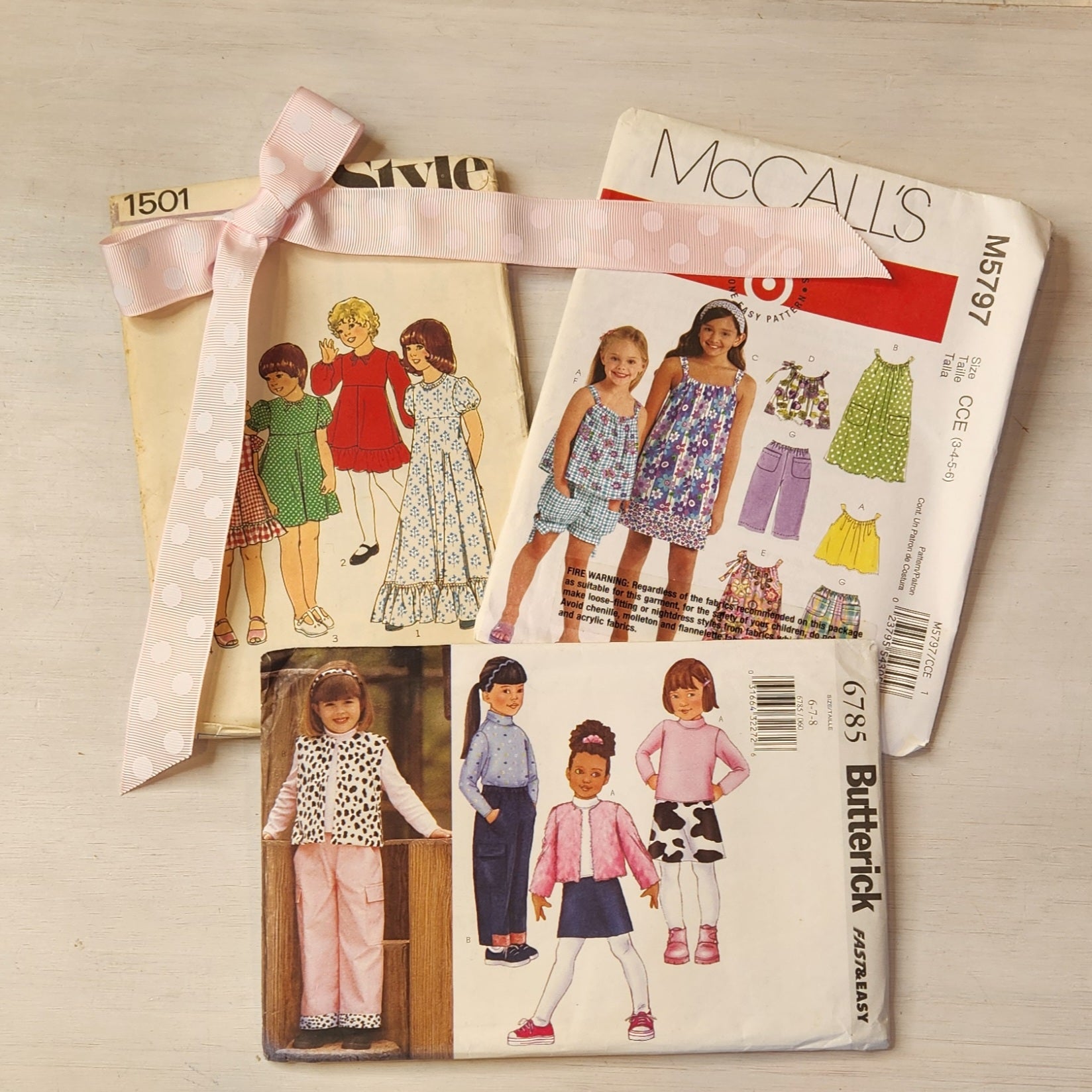 3 uncut paper patterns offering a variety of outfits to sew for ages 3-8yrs ranging from dresses, pants, tops, shorts and jackets