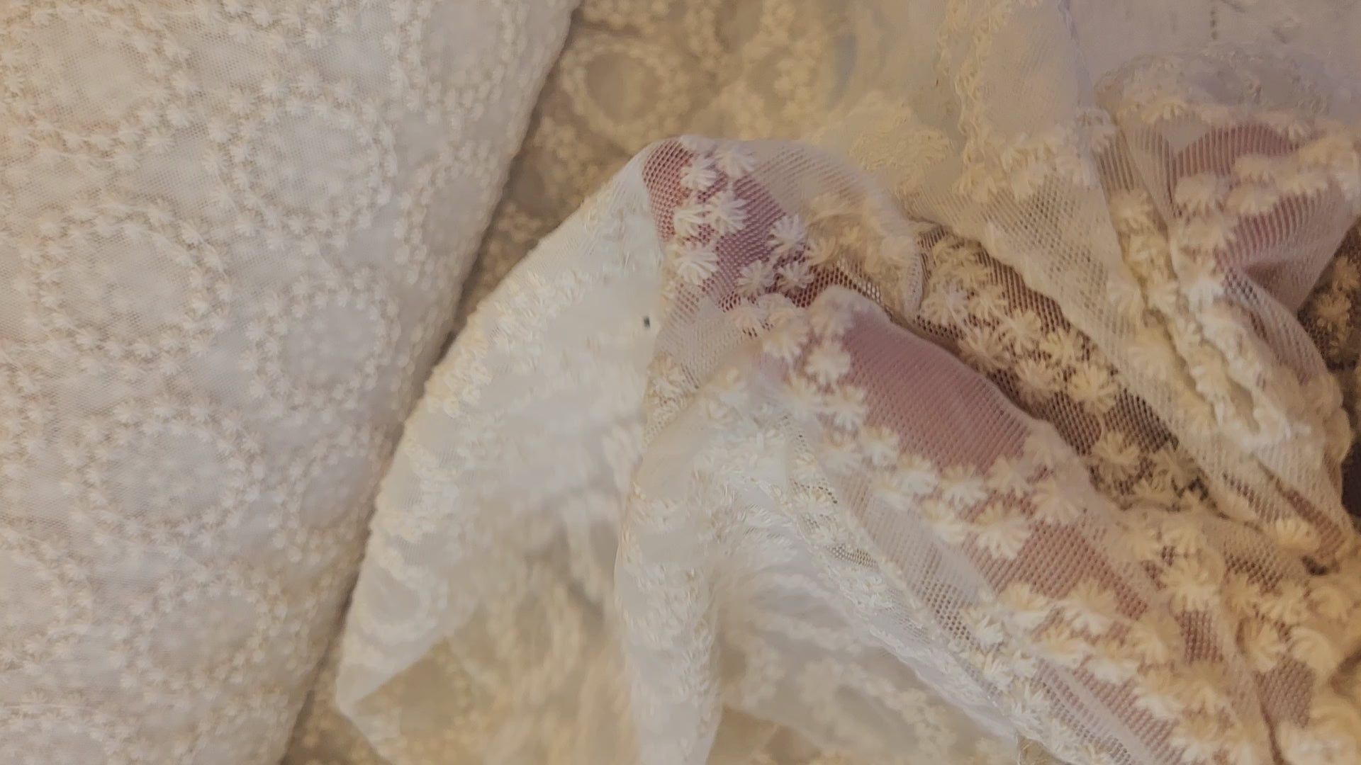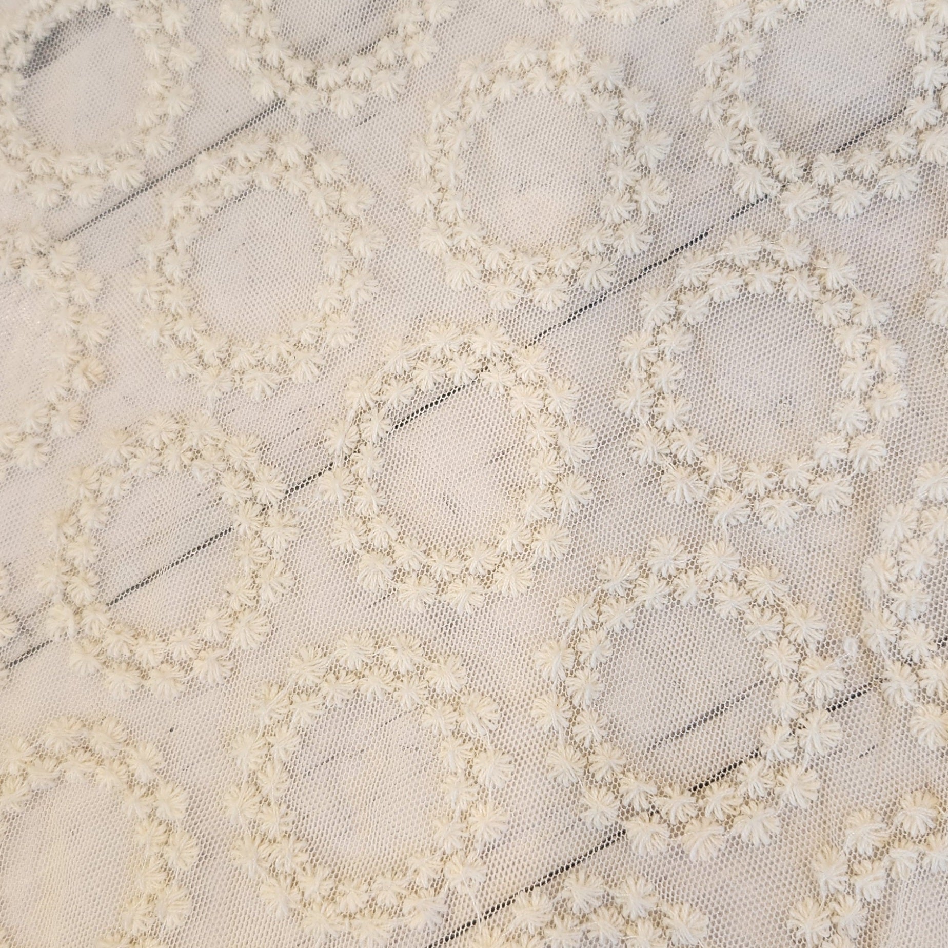 weight: lightweight with fine patterning Embroidered mi i flowers in a circle pattern on a net background
