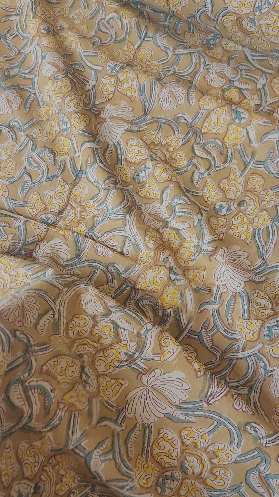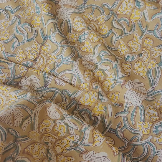 Block print cotton fabric is created using a technique where designs are carved into wooden blocks, which are then used to stamp patterns onto cotton fabric. This traditional method, often done by hand, results in unique, handcrafted textiles with slight variations in each piece. The process involves preparing the fabric, carving the blocks, mixing dyes, and carefully applying the blocks to the fabric, often multiple times for different colours. Variations in print are to be expected in this kind of hand created design