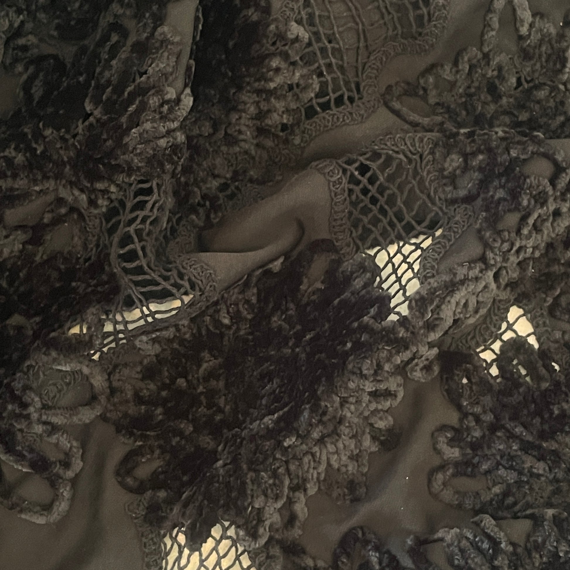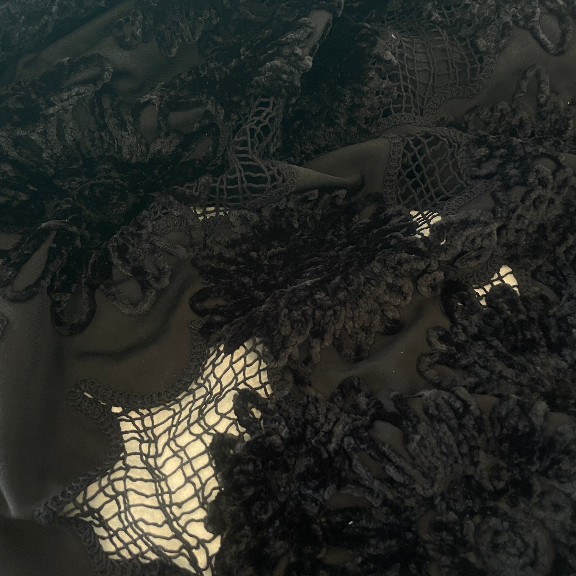 Weight: Mid Weight with a heavy drape. Lightweight one way stretch jersey base with embroidered open mesh detailing and chenille stitched flowers