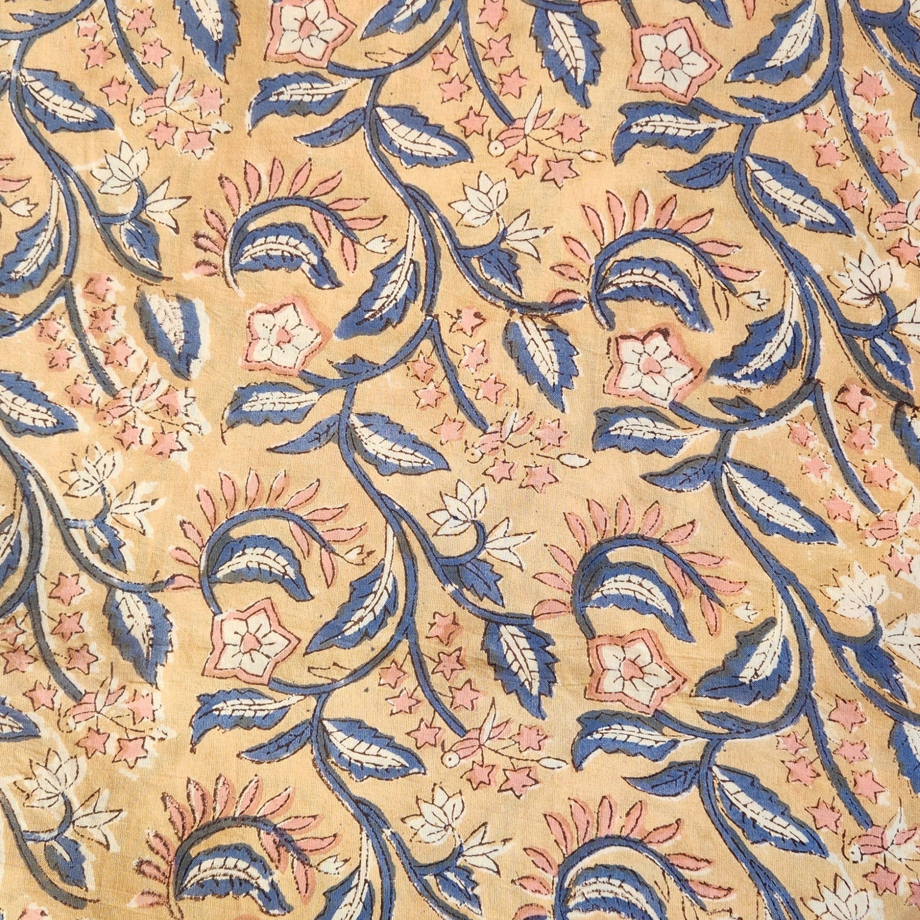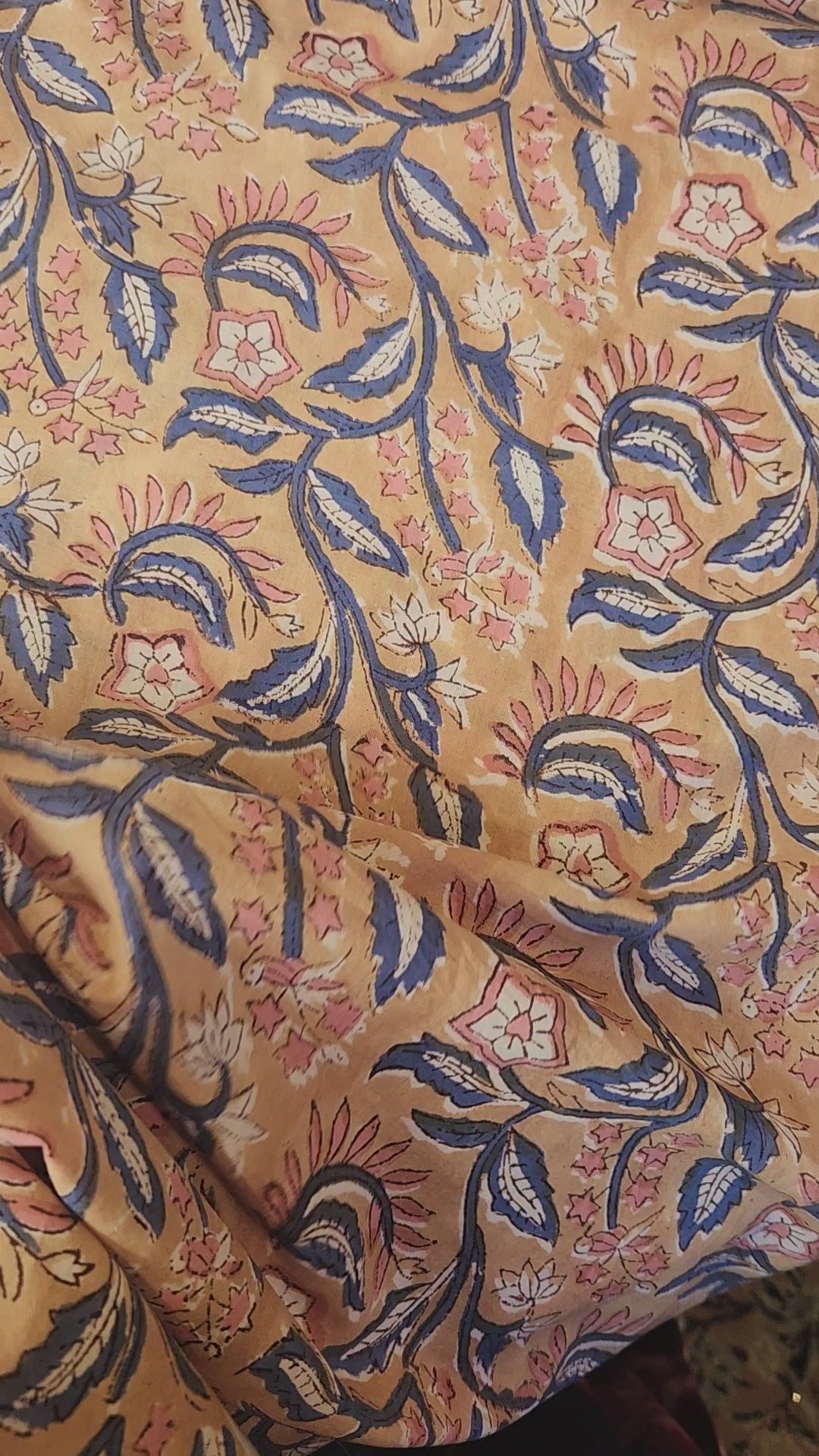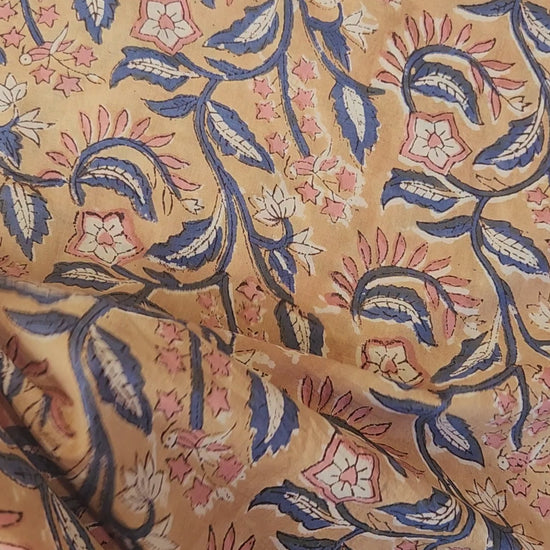 Block print cotton fabric is created using a technique where designs are carved into wooden blocks, which are then used to stamp patterns onto cotton fabric. This traditional method, often done by hand, results in unique, handcrafted textiles with slight variations in each piece. The process involves preparing the fabric, carving the blocks, mixing dyes, and carefully applying the blocks to the fabric, often multiple times for different colours. Variations in print are to be expected in this kind of hand created design