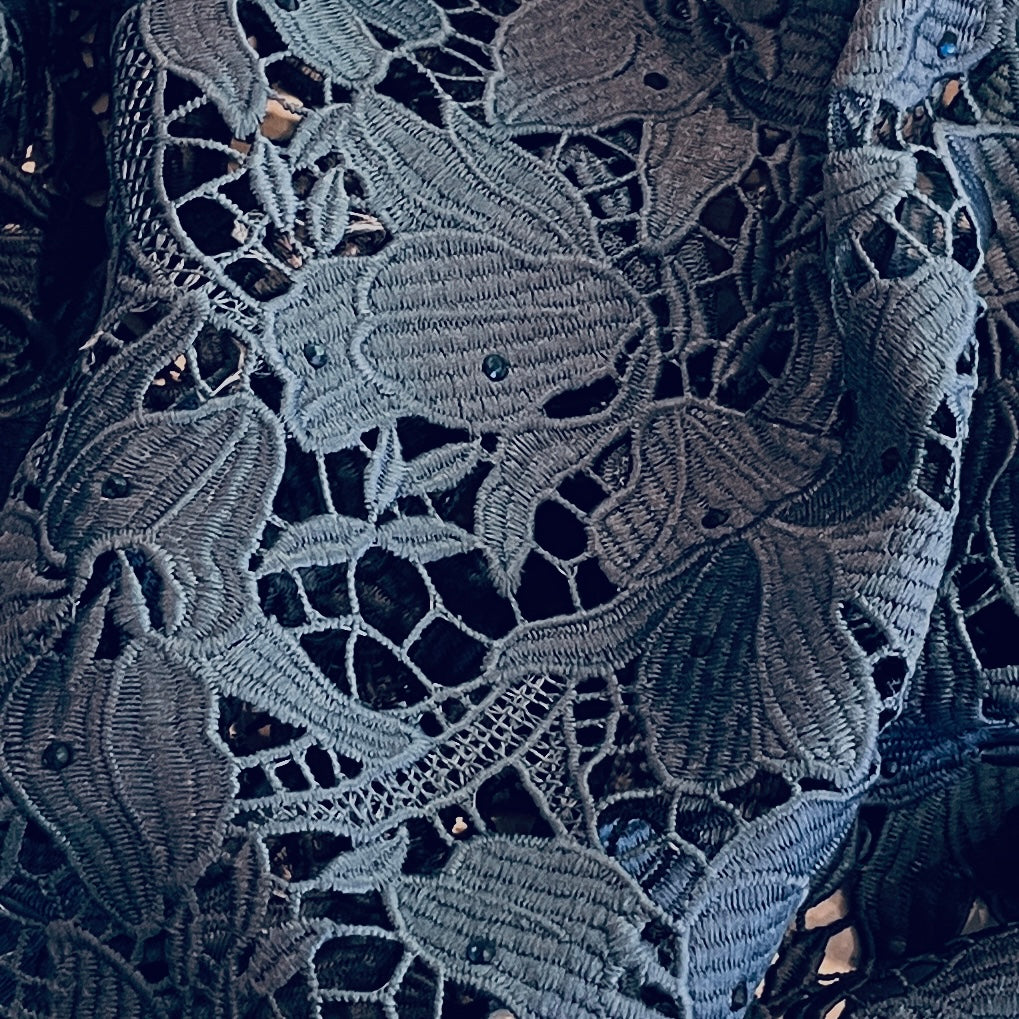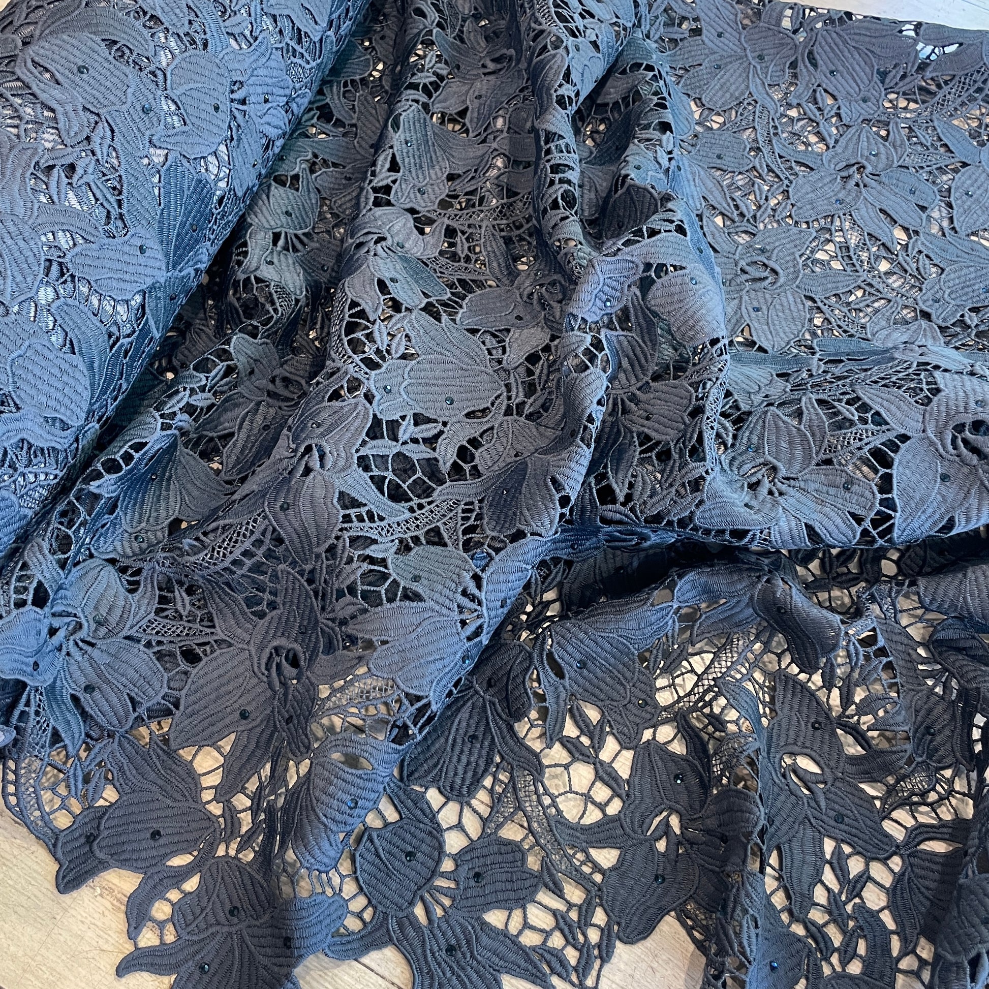 Weight: Mid Weight with a heavy drape. Has a scallop border both selvedge. Scattered heat fix diamanté crystals throughout