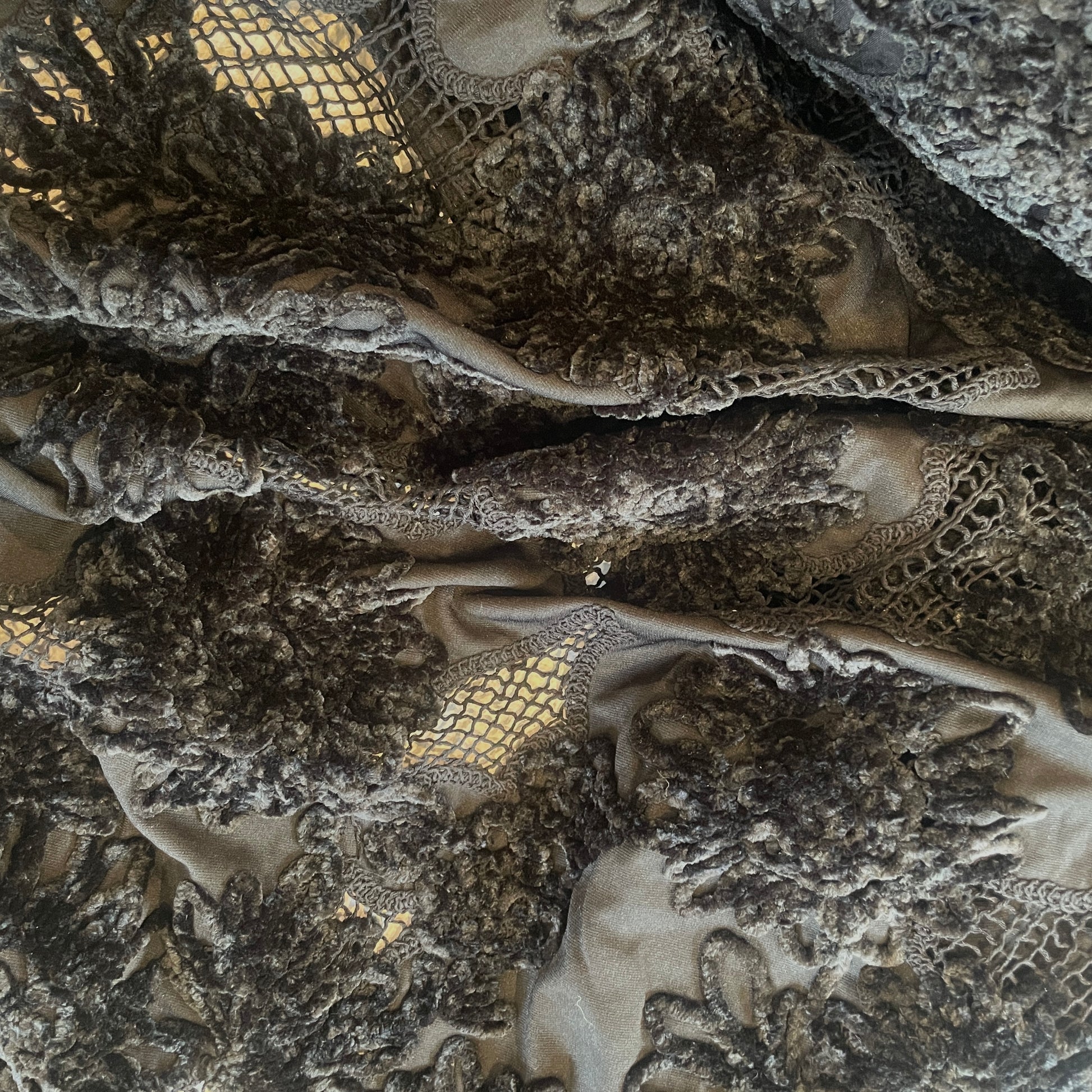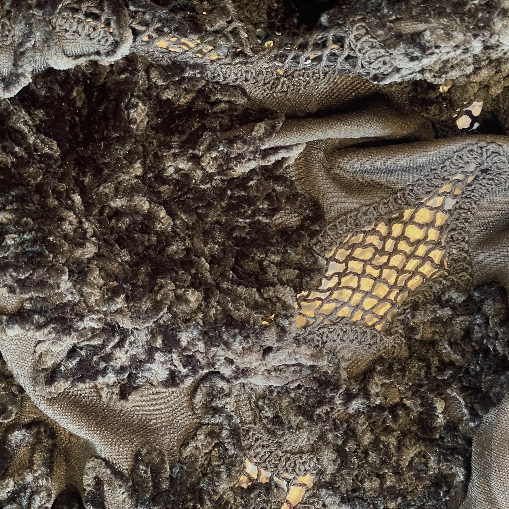 Weight: Mid Weight knit base with one way stretch. Has all over detailed embroidery and lattice cut outs