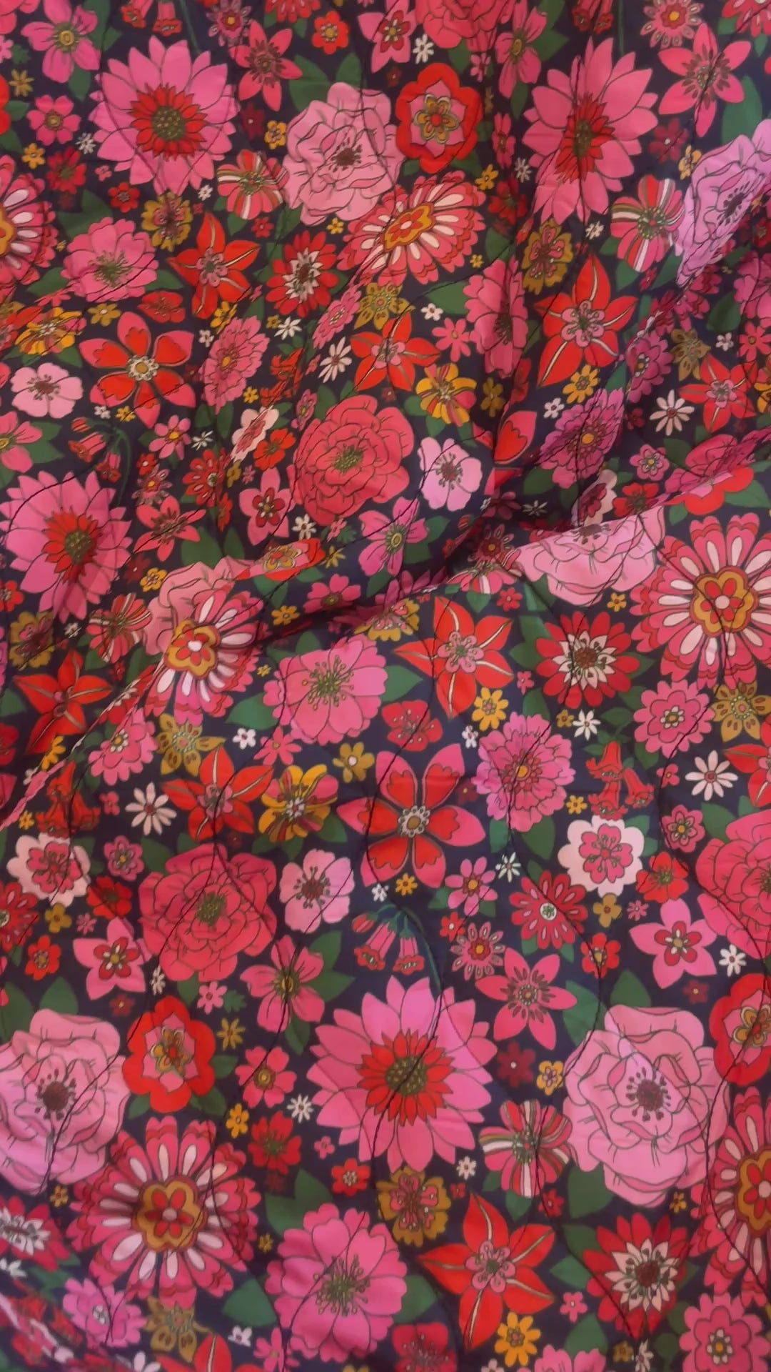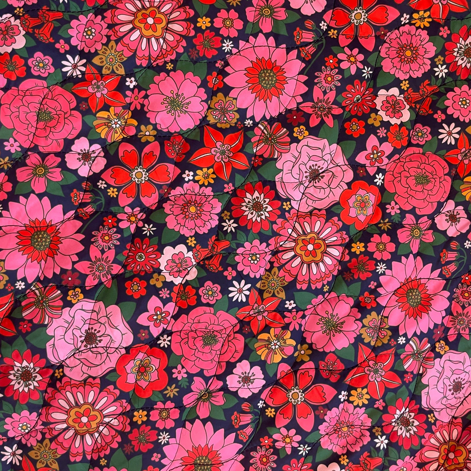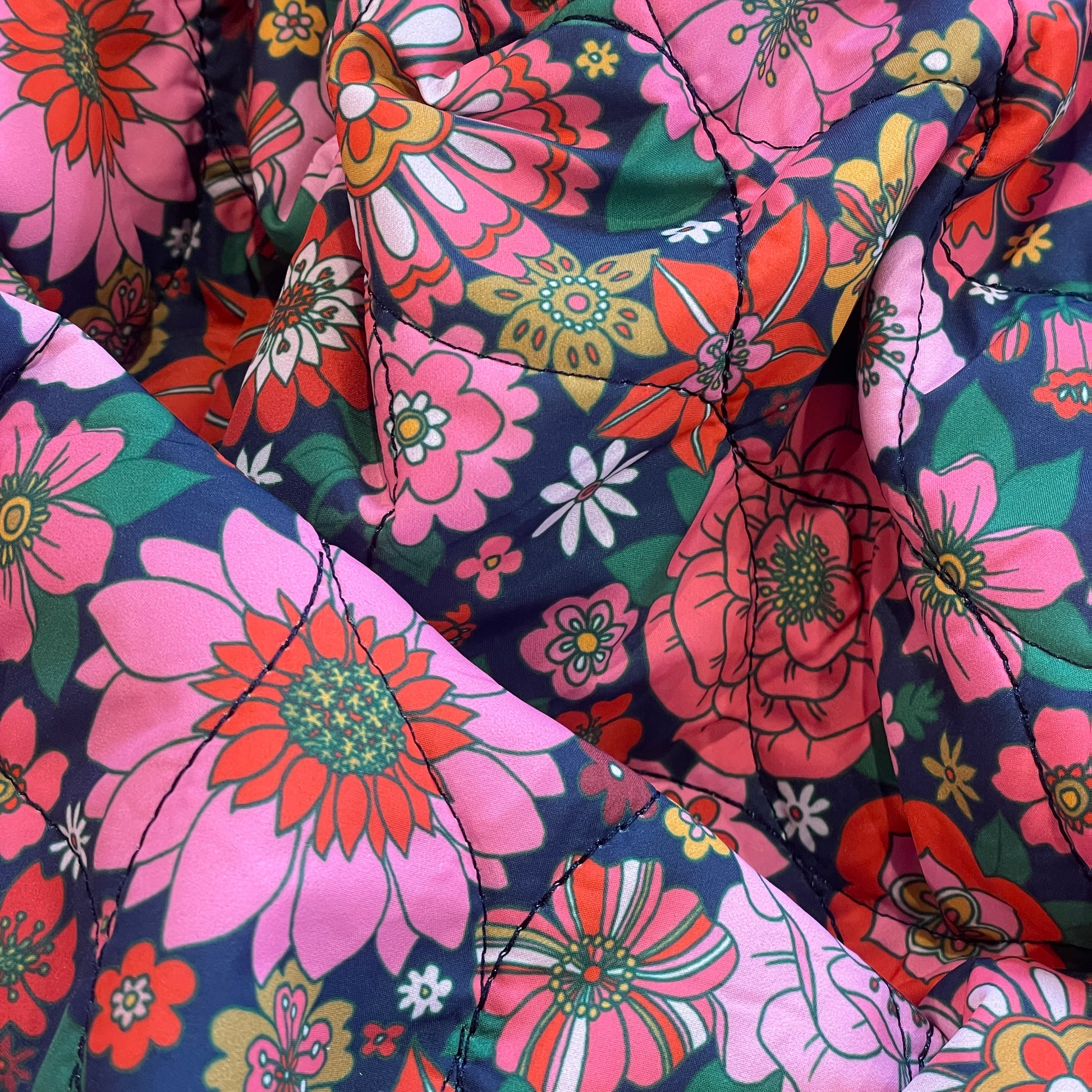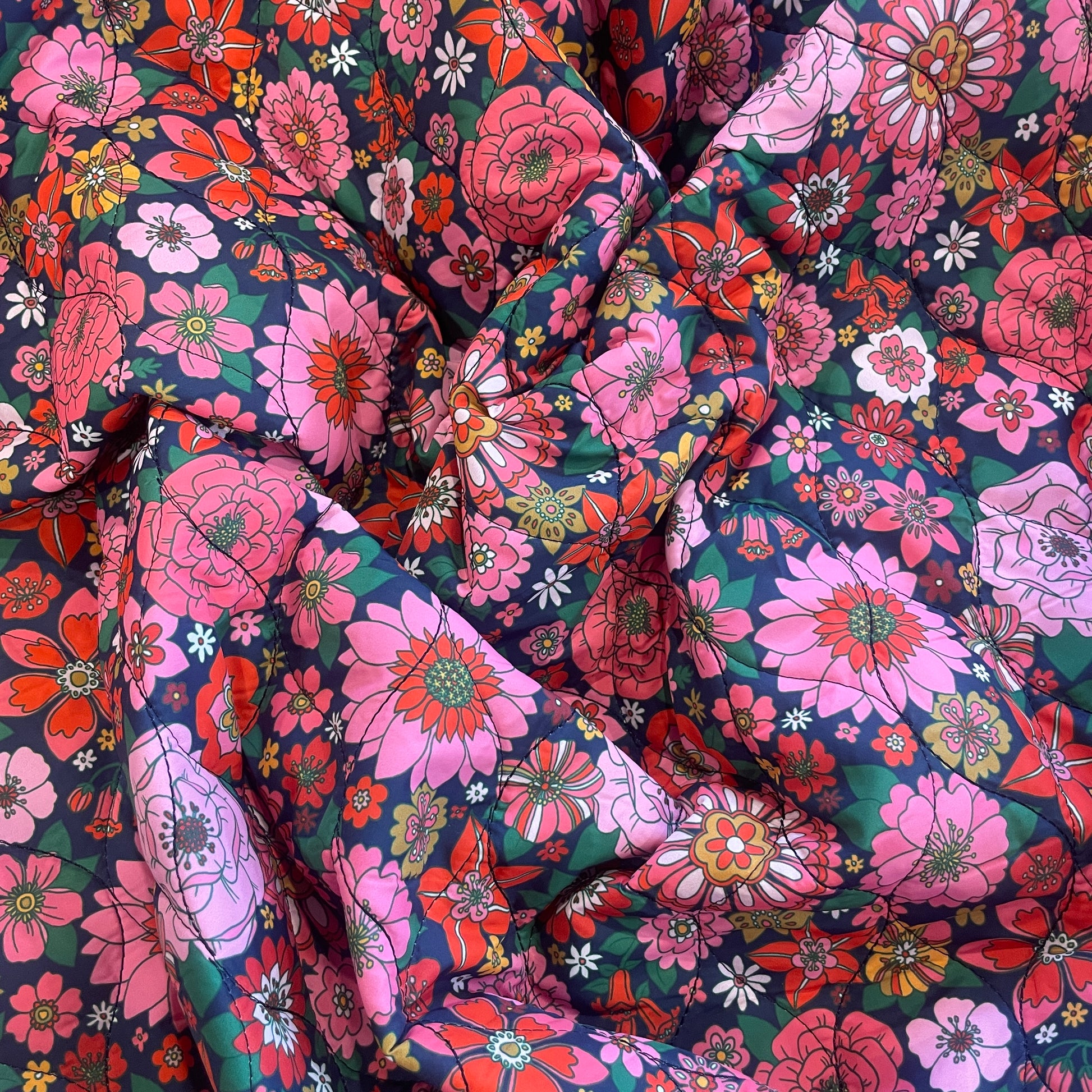 This exclusive light to medium weight quilted puffer fabric is reversible so you don't need to line your garment if you don't want to. This floral puffer print fabric has navy blue on the reverse and a layer of wadding in the middle.