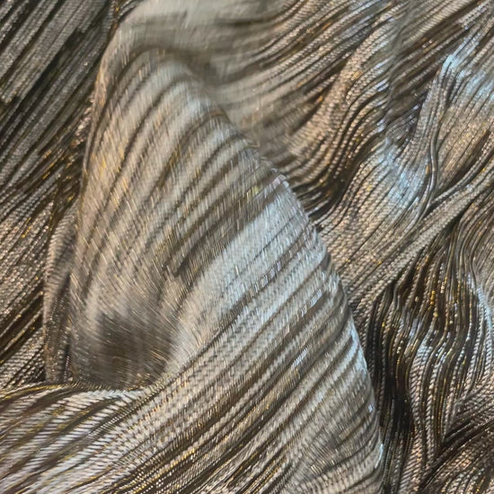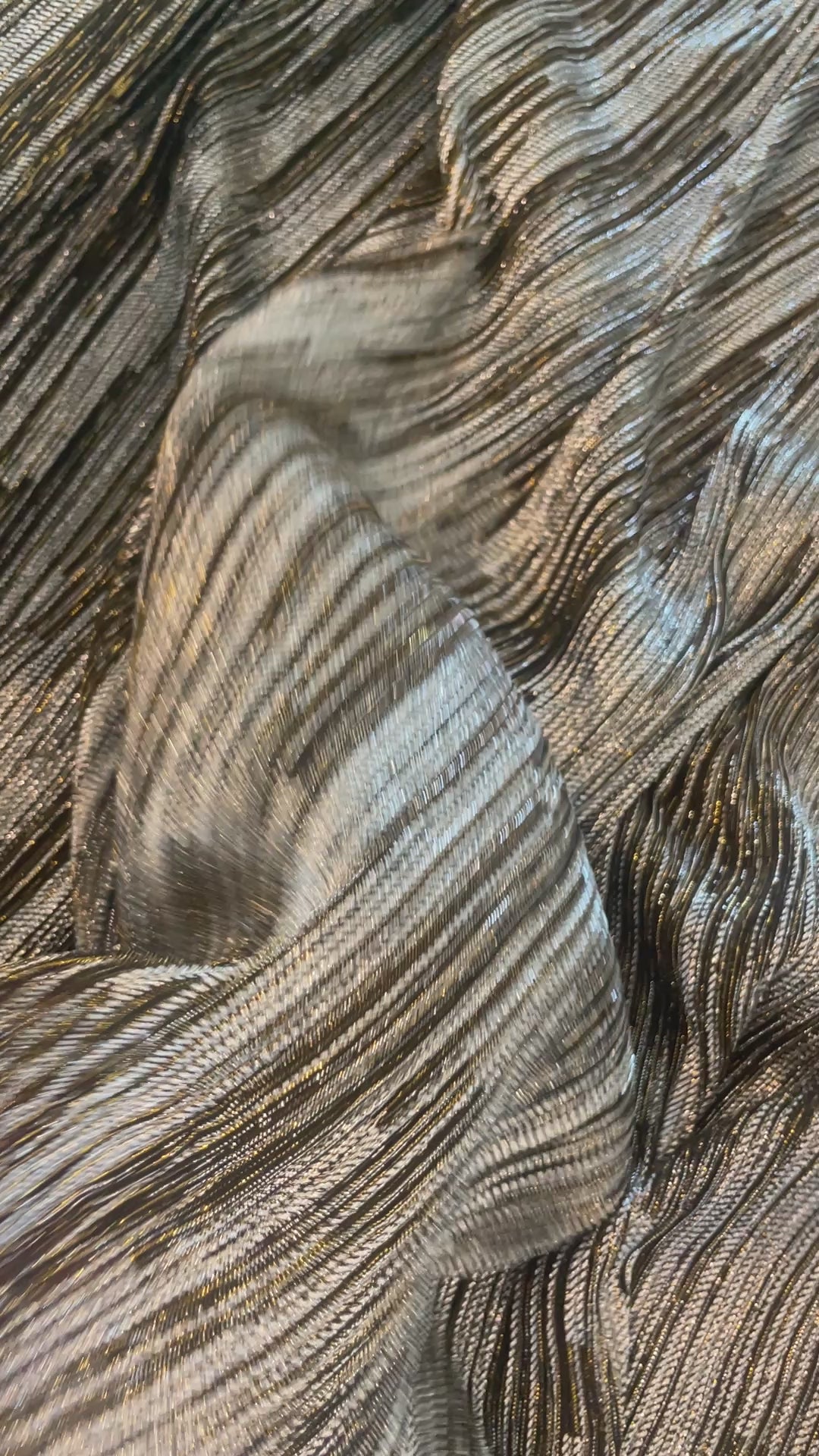 weight: lightweight perma pleat ultra fine knit with metallic thread and foil coating. Has two way stretch