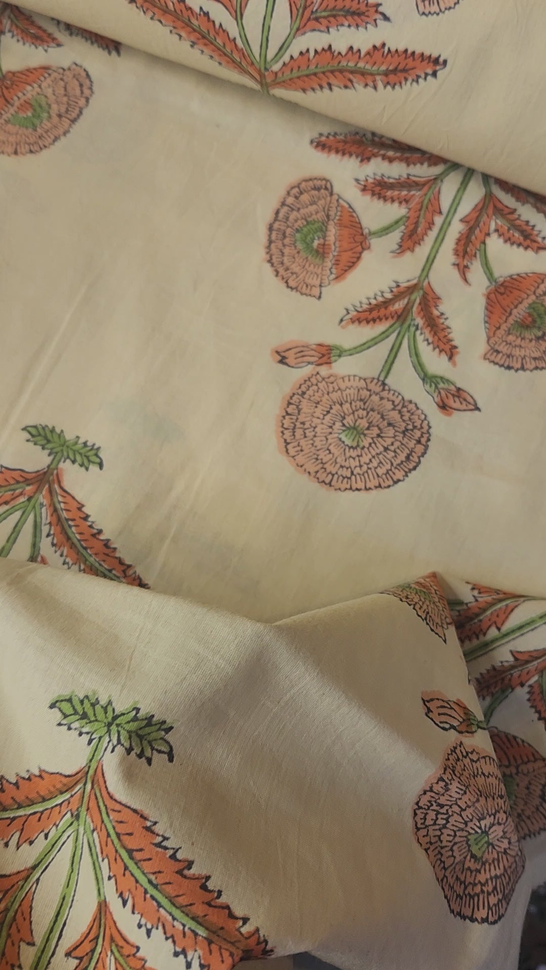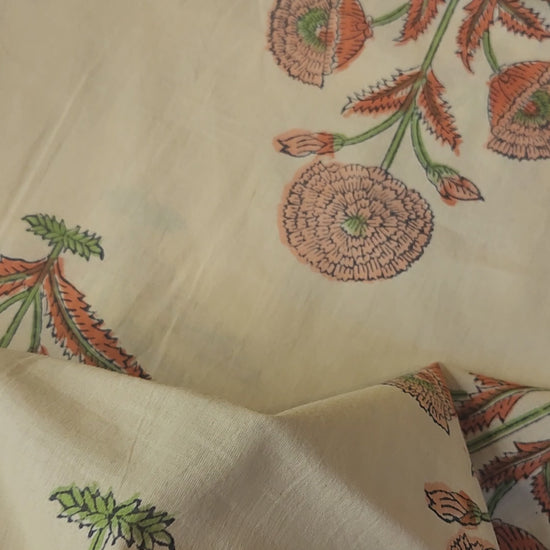 Block print cotton fabric is created using a technique where designs are carved into wooden blocks, which are then used to stamp patterns onto cotton fabric. This traditional method, often done by hand, results in unique, handcrafted textiles with slight variations in each piece. The process involves preparing the fabric, carving the blocks, mixing dyes, and carefully applying the blocks to the fabric, often multiple times for different colours. Variations in print are to be expected in this kind of hand created design