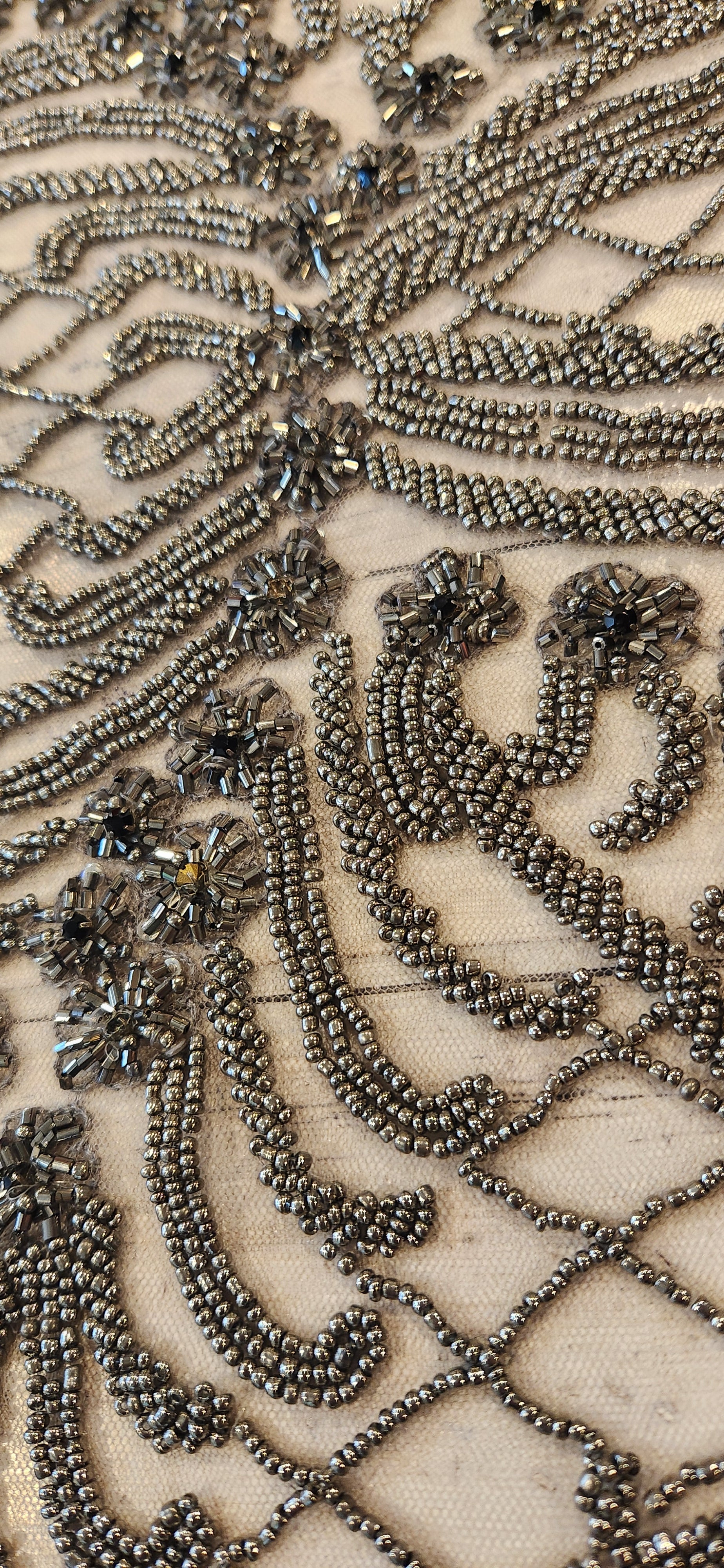 Weight: light weight one way knit base with all over beads creating a heavy fabric with heavy drape