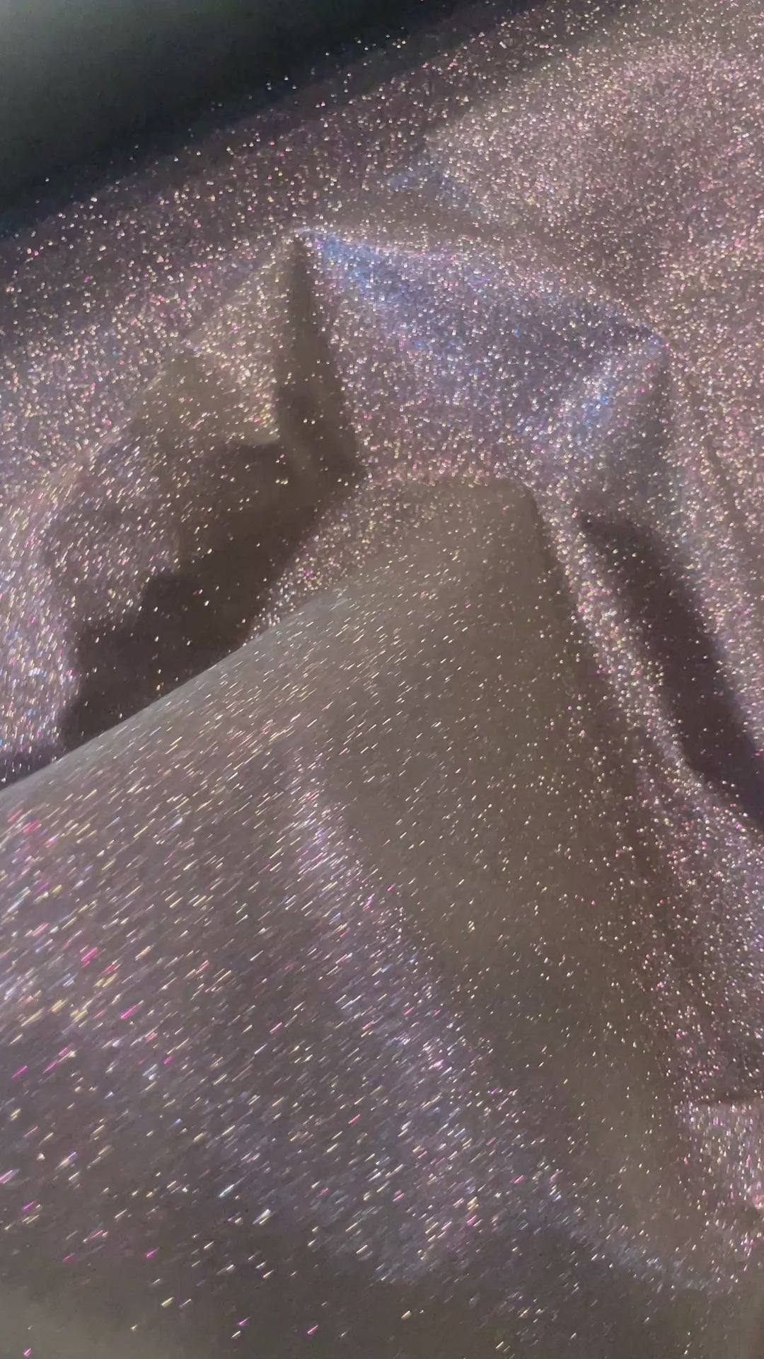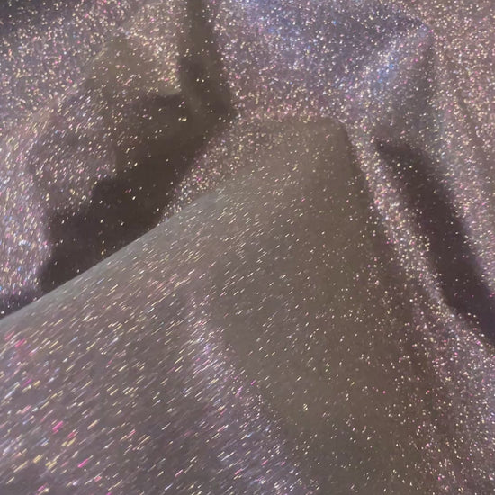Content: polyester ( Has a layer of knit fused to reverse with a layer of glitter fused to face side ) Glitter is extremely iridescent and does not rub off easily.
