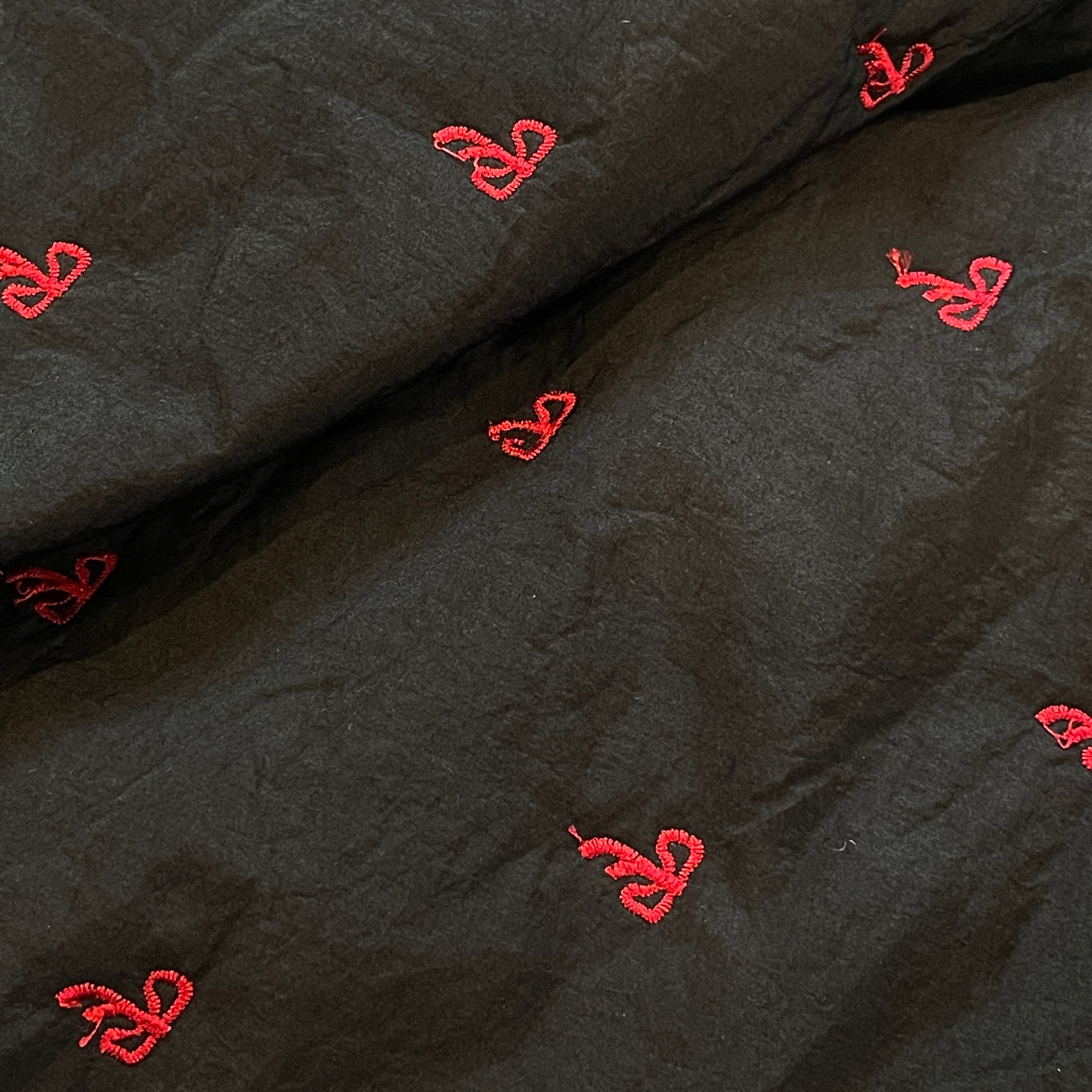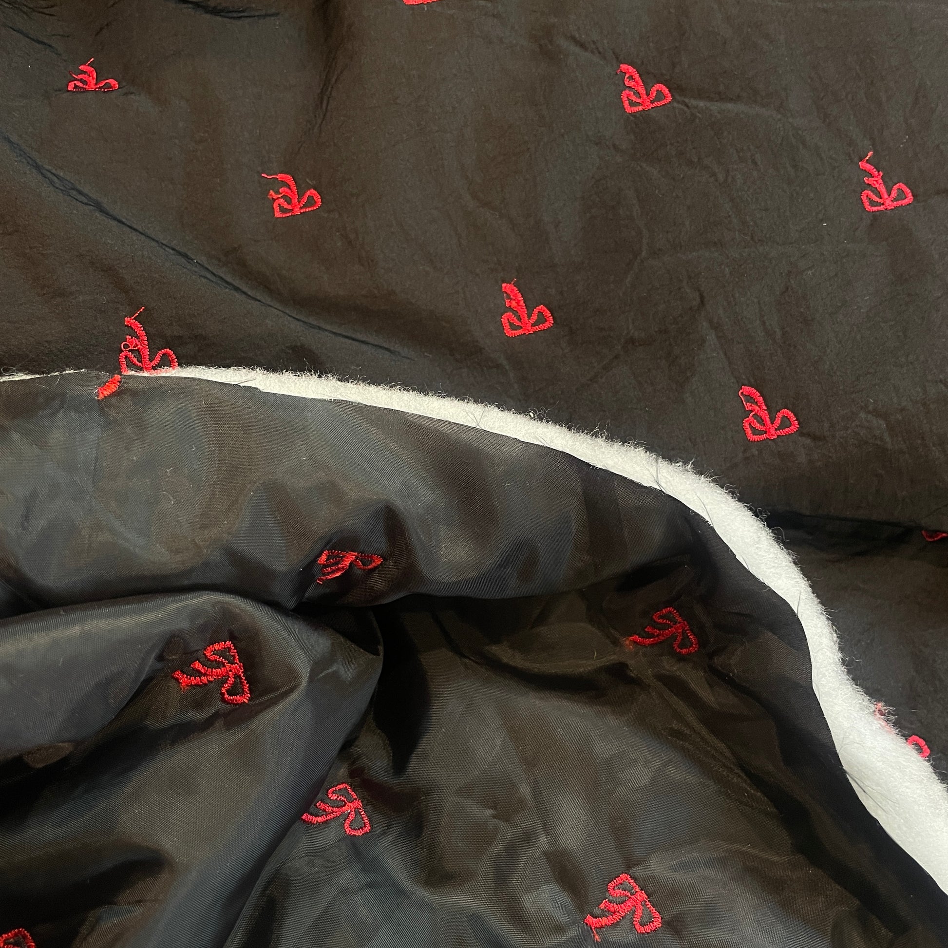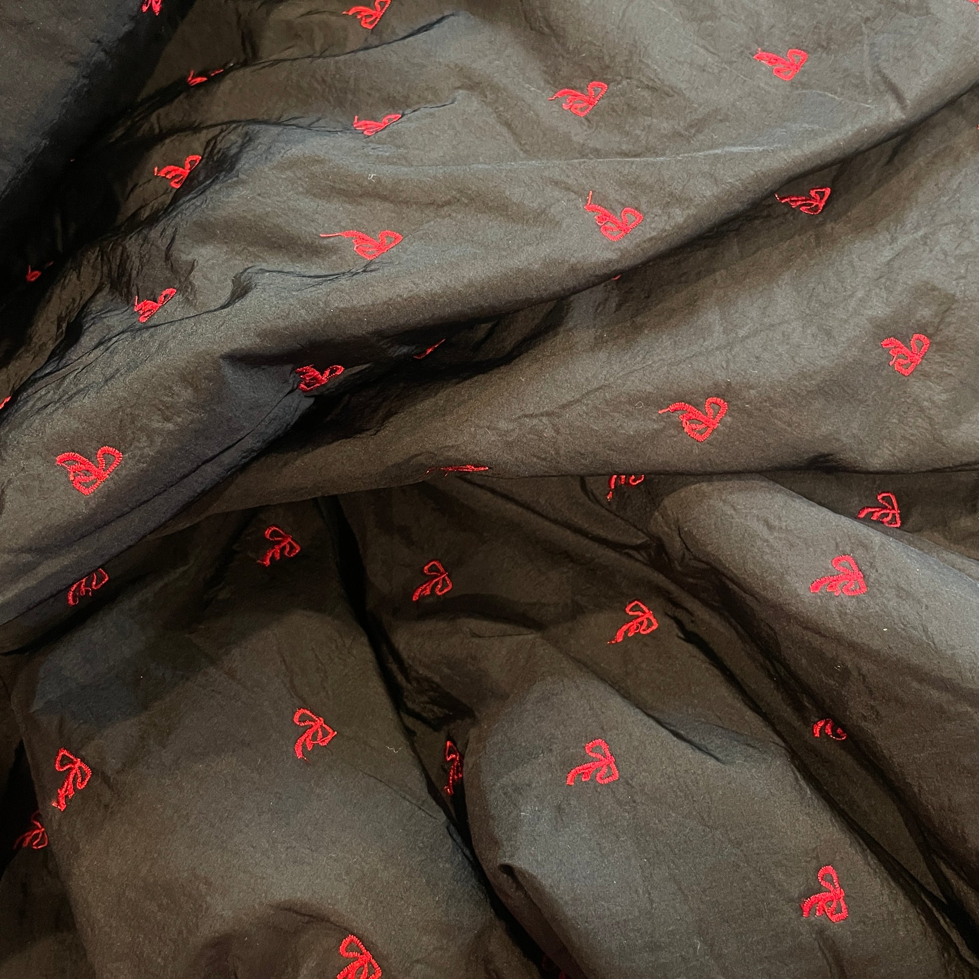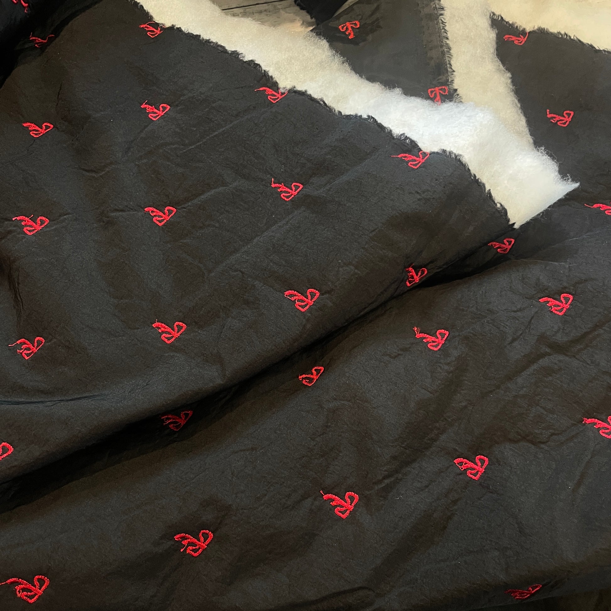 Ruban has wonderful red bows embroidered onto a water resistant quilted reversible puffer dressmaking fabric. Each bow measures approx. 15mm