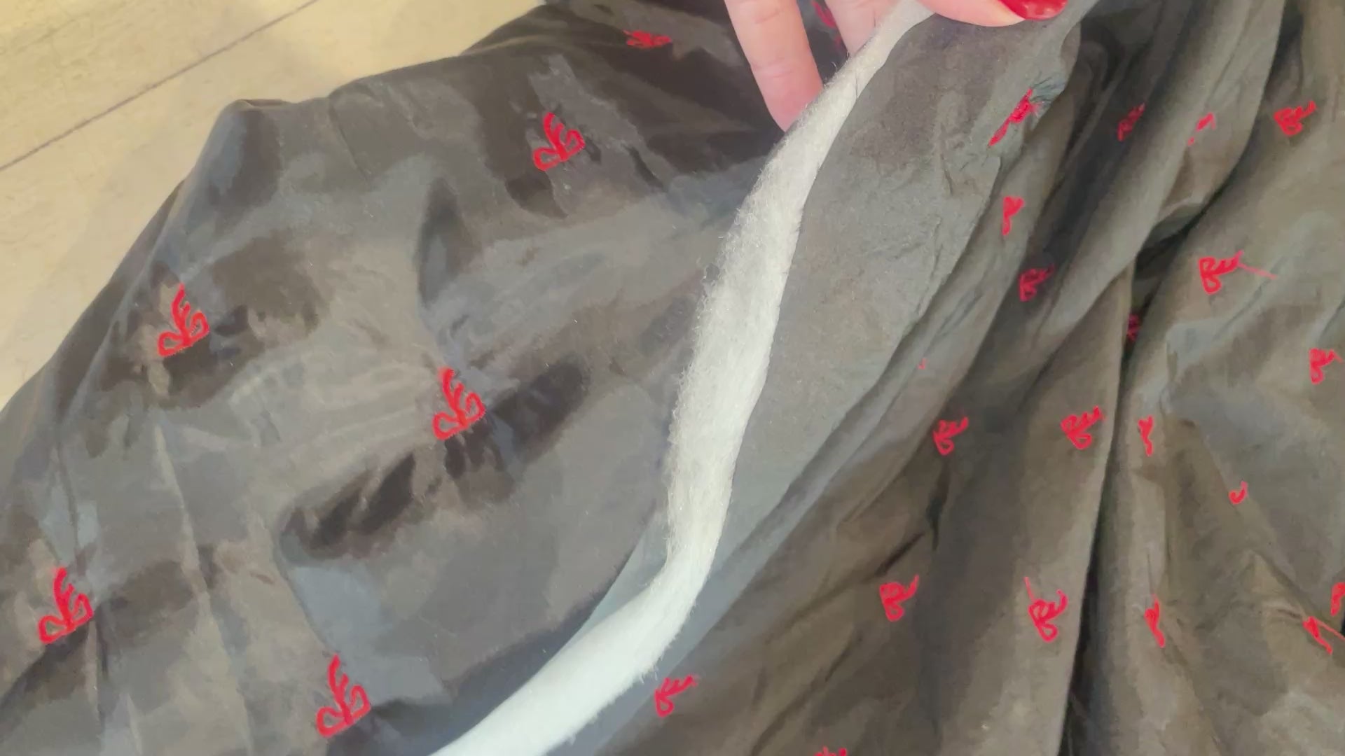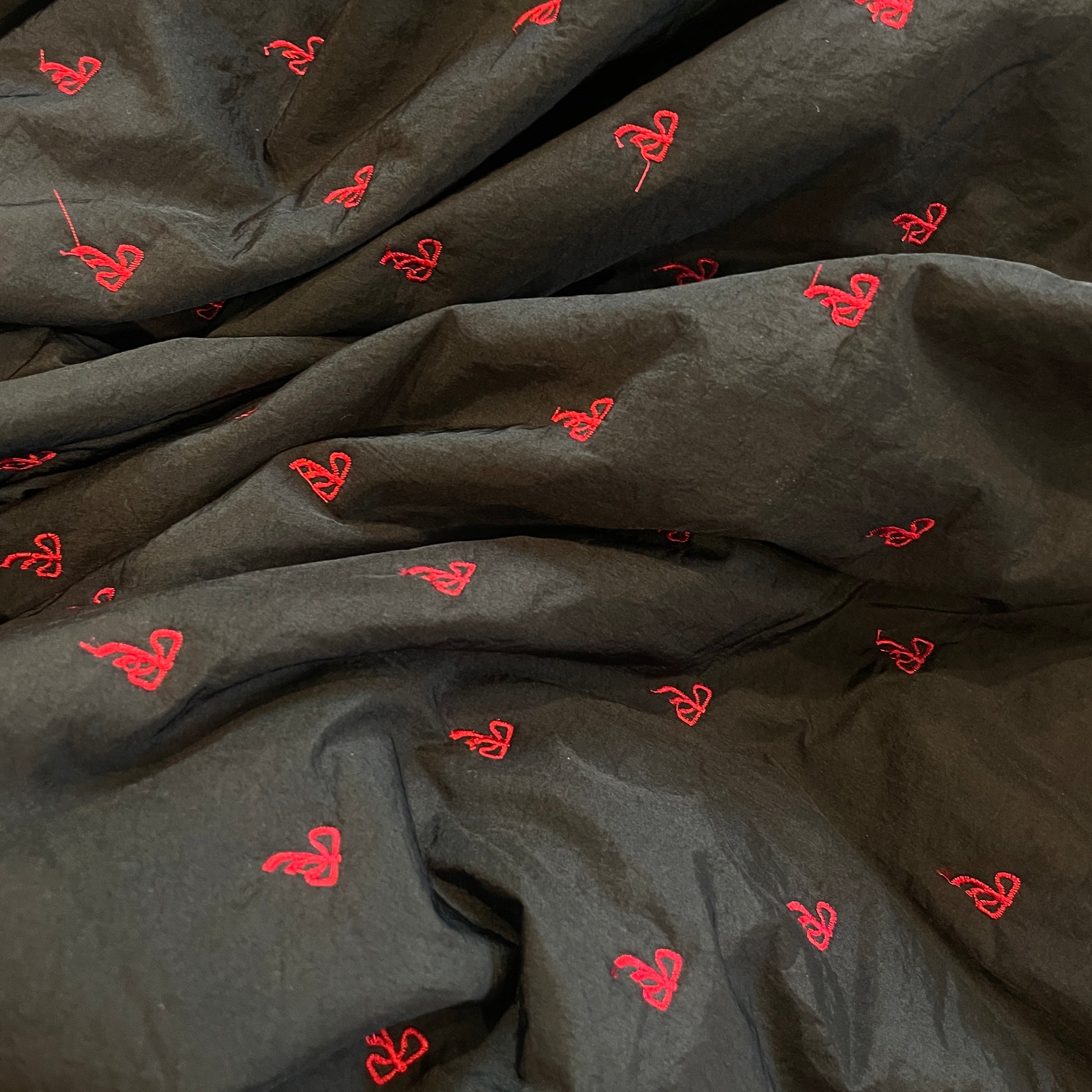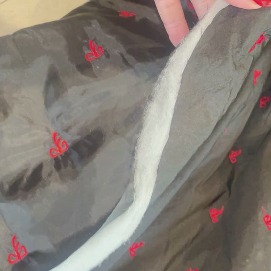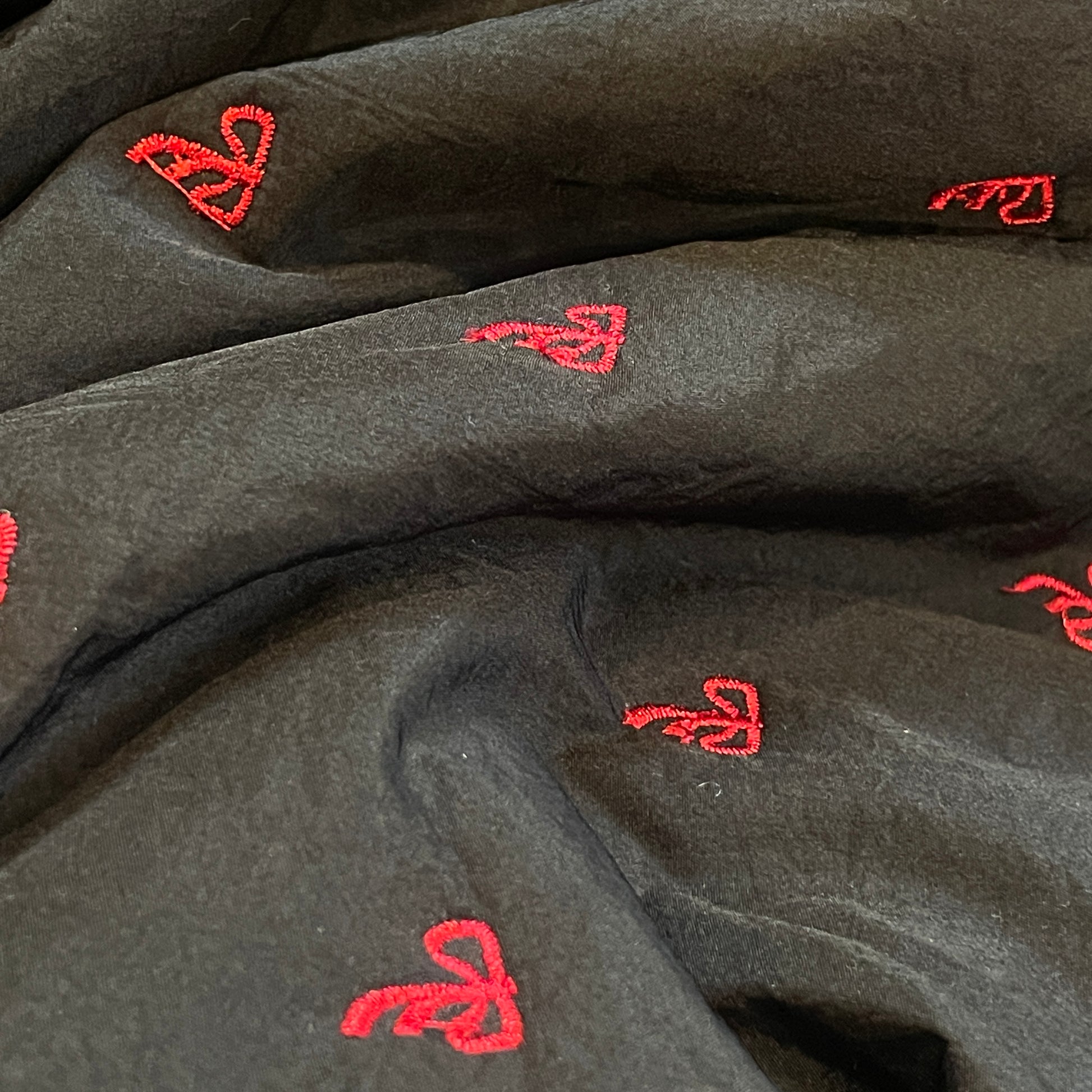 Ruban has wonderful red bows embroidered onto a water resistant quilted reversible puffer dressmaking fabric. Each bow measures approx. 15mm