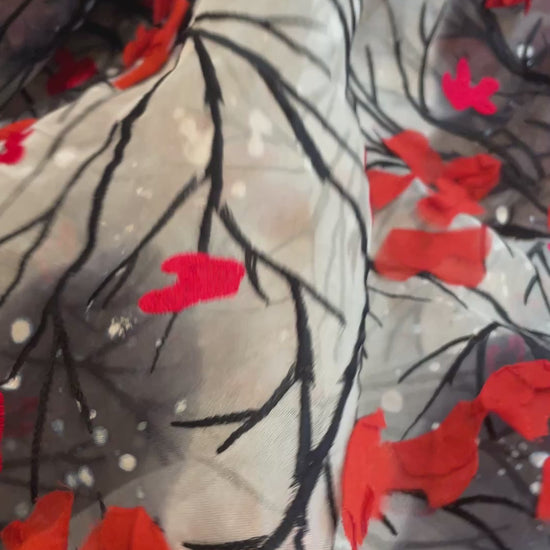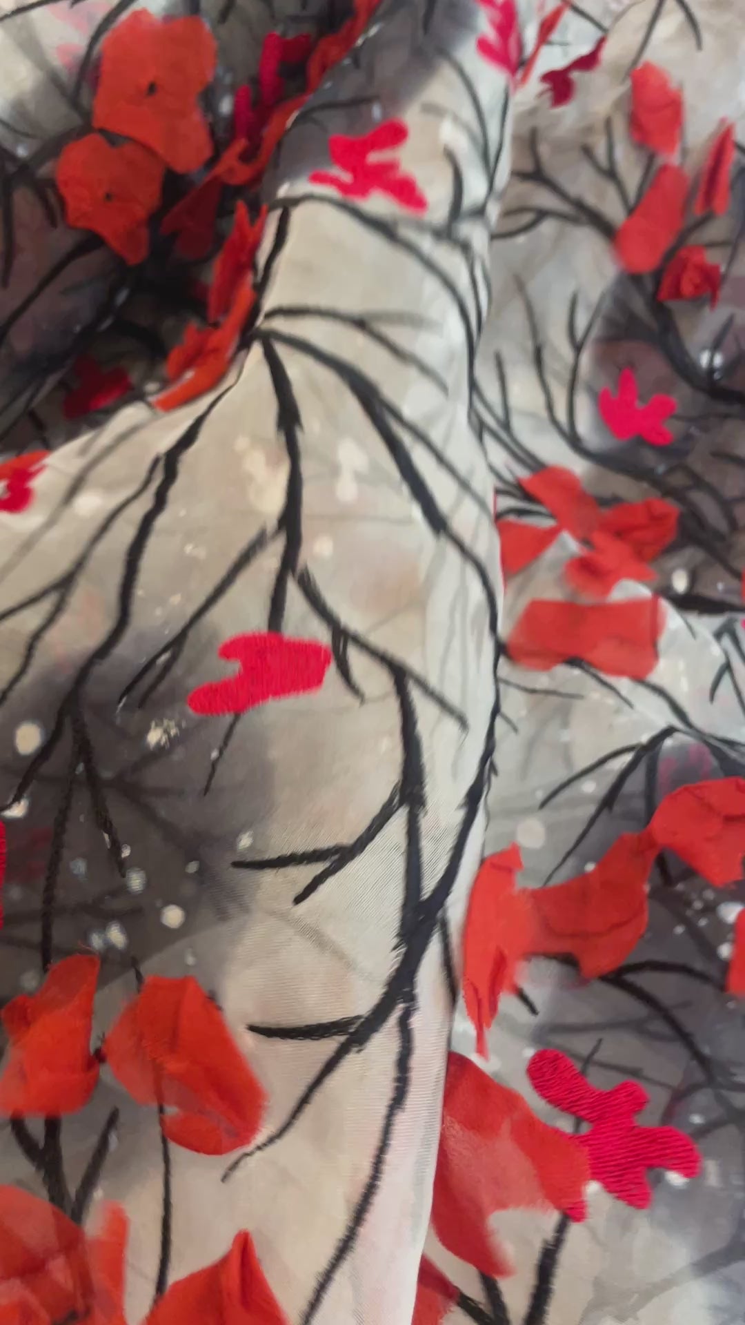 Weight: light Weight with a floaty drape. Scattered all over embroidery with cut out silk chiffon flower petals