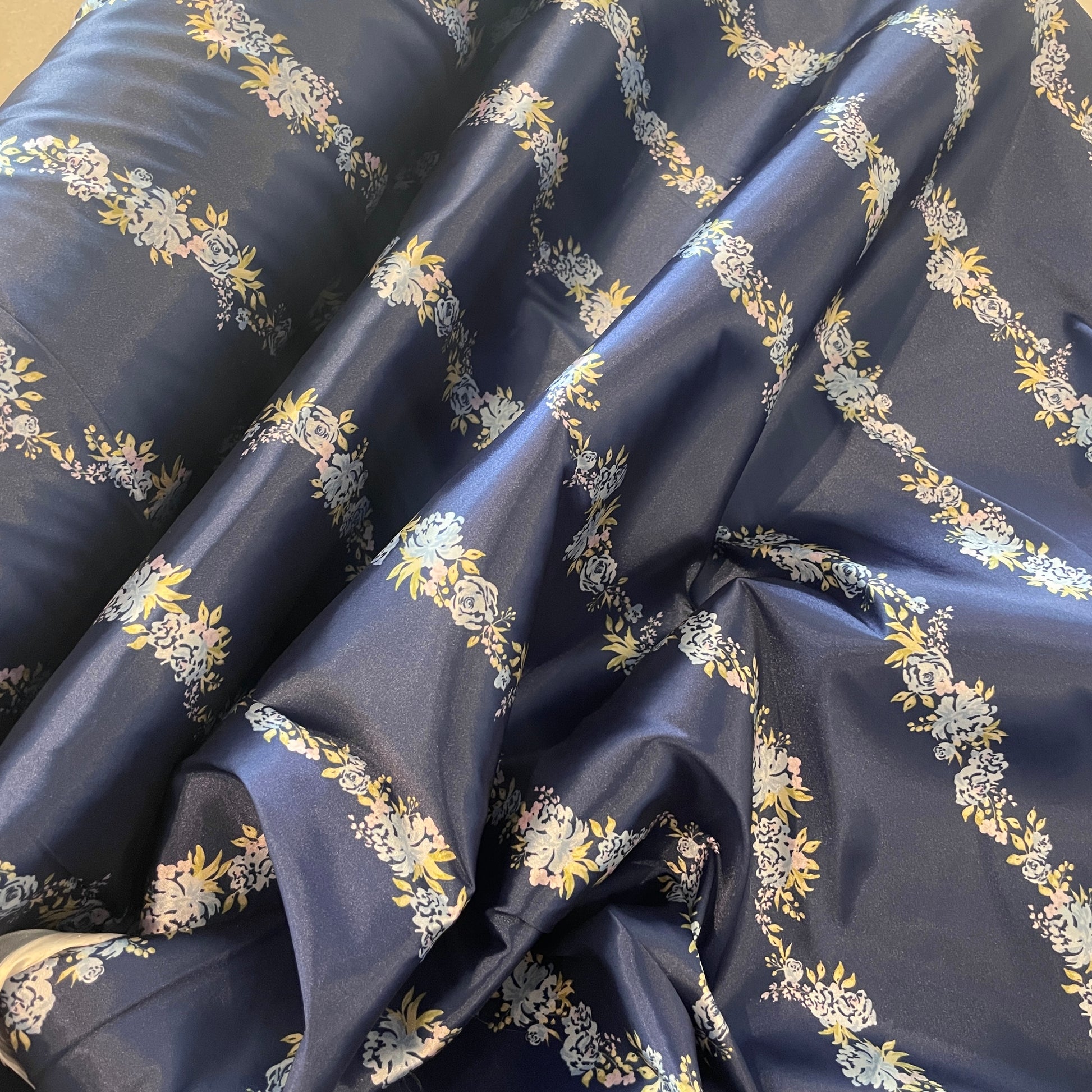Trocadero blue floral stripe stretch satin